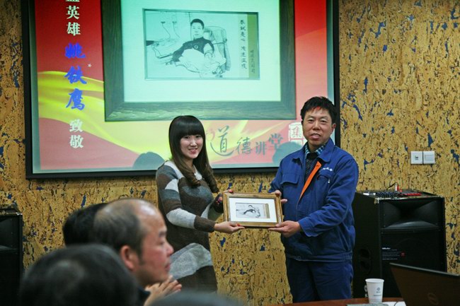 在學(xué)模范環(huán)節(jié),我們的“身邊人”—來(lái)自公司系統(tǒng)中環(huán)水務(wù)有限公司的蚌埠助人為樂(lè)好人姚鐵鷹,講述他十年義務(wù)獻(xiàn)血2萬(wàn)5千毫升的感人事跡。在活動(dòng)現(xiàn)場(chǎng),公司向姚鐵鷹贈(zèng)送了由志愿者們制作的記錄他獻(xiàn)血義舉時(shí)的肖像,并向全體職工倡議:向蚌埠好人姚鐵鷹學(xué)習(xí),將志愿服務(wù)化作自覺(jué)行為和生活方式。