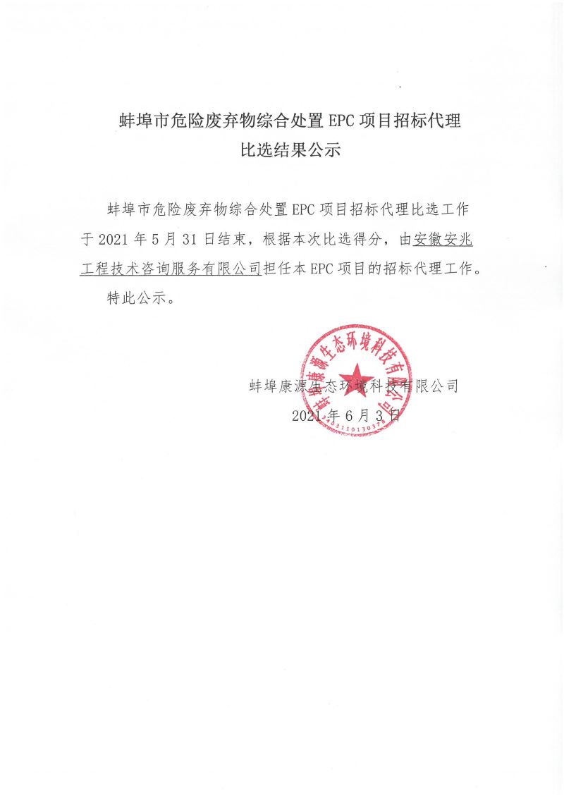 蚌埠市危險(xiǎn)廢棄物綜合處置EPC項(xiàng)目招標(biāo)代理比選結(jié)果公示