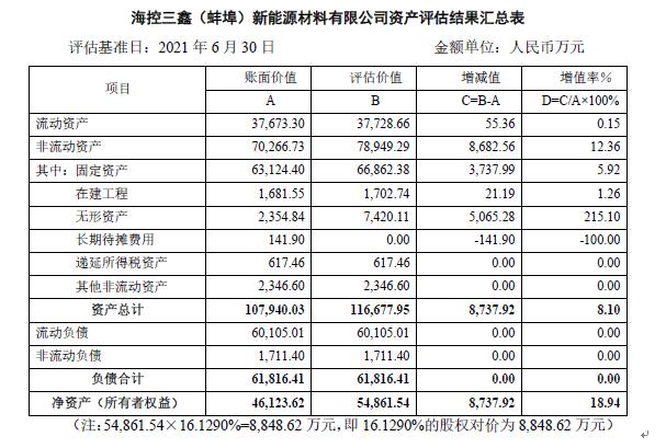蚌埠投資集團有限公司擬轉(zhuǎn)讓所持??厝危ò霾海┬履茉床牧嫌邢薰竟蓹?quán)的行為已經(jīng)市國資委批復(fù)同意。根據(jù)國有資產(chǎn)管理及資產(chǎn)評估有關(guān)規(guī)定,現(xiàn)對所涉及的資產(chǎn)評估結(jié)果進行公示。