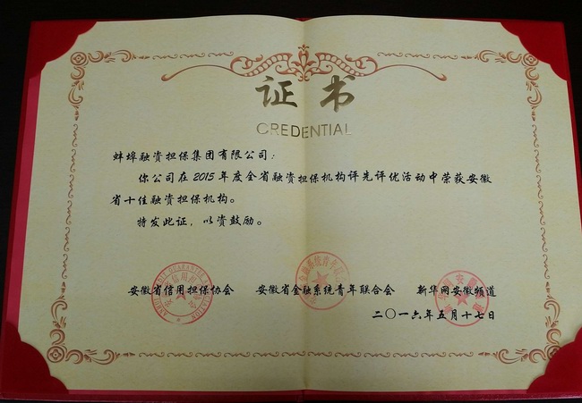 擔(dān)保公司榮獲“安徽省十佳融資擔(dān)保機(jī)構(gòu)”榮譽(yù)稱(chēng)號(hào)